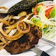 Marinated steak and grilled with onions. Served with rice, beans, and homemade tortillas.